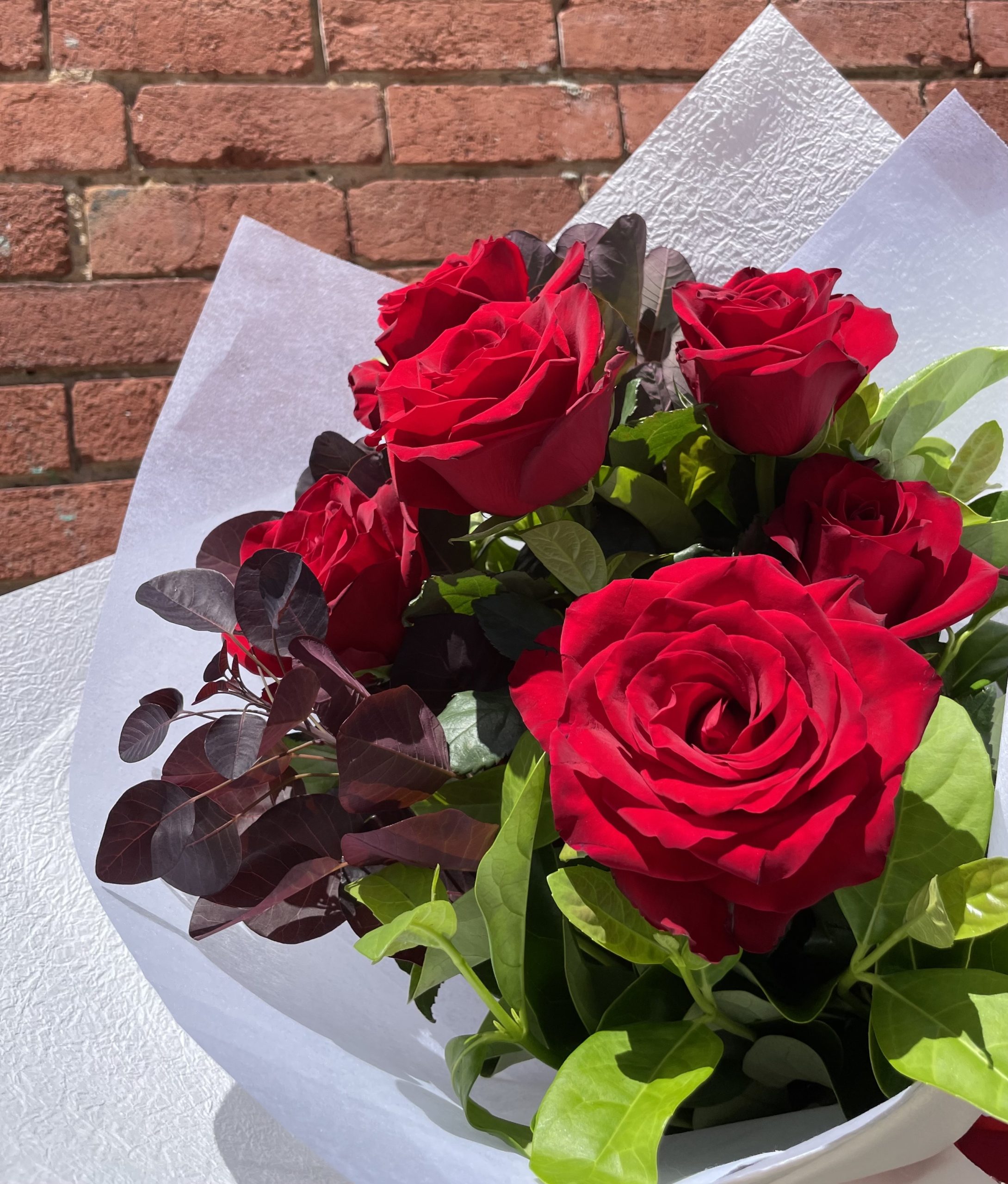 Our popular traditional 1/2 dozen Premium Long Stem Red Roses with seasonal lush foliage, presented wrapped and finished with complimentary ribbons.